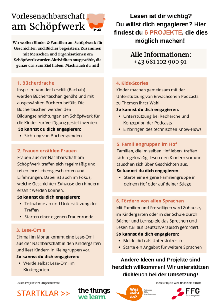 Eine frühe Leseförderung führt zu besseren Bildungschancen und trägt damit zur Verringerung des Armutsrisikos bei. Das Projekt „Vorlese-Nachbarschaft“ zielt darauf ab, aus Familien, die nicht vorlesen, Familien zu machen, die vorlesen. Die Initiativen und Aktivitäten sollen von der Nachbarschaft selbst ausgehen und weitergeführt werden. Dieser Prozess wird initiiert, begleitet und evaluiert. Das Projekt wird im Quartier „Am Schöpfwerk“ durchgeführt.